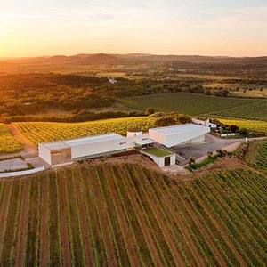 Vidigueira. Do anfiteatro no último andar da adega, as encostas suaves se...